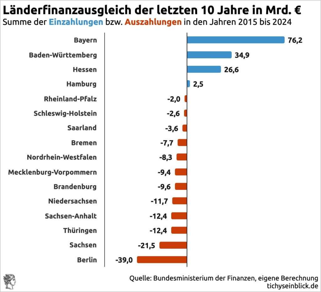 Die Zahlen sprechen eine deut­liche Sprache: Von 16 Bundes­ländern zahlen vier mehr ein als sie beziehen, beim Rest ist es umgekehrt. Dass Bayern und Baden-Württemberg am meisten bezahlen müssen, liegt vermutlich nicht nur daran, dass sie von ihrer Nähe zur Schweiz profitieren, sondern vor allem daran, dass sie seit Bestehen der Bundesrepublik durchwegs die konservativste Politik betrieben haben. Um­gekehrt liegt auf der Hand, wa­rum Berlin, das von betrunkenen Matrosen nicht schlechter geführt werden könnte, am meis­ten Finanzausgleich bezieht.